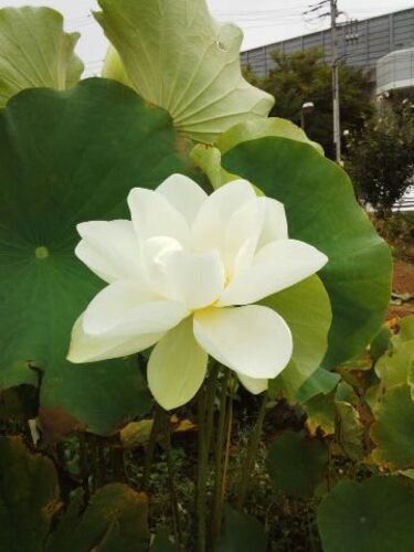 週に1度・・・たった3時間ですがお仕事で伺っている施設の 玄関先のお庭に真っ白な大きなハスの花が咲いてます。 週一度しか行かないのできれいに咲いている状態で見られたのは 今年が初めて・・・・・ まっすぐにのびた茎の先の大きく優雅なハスの花! 私…